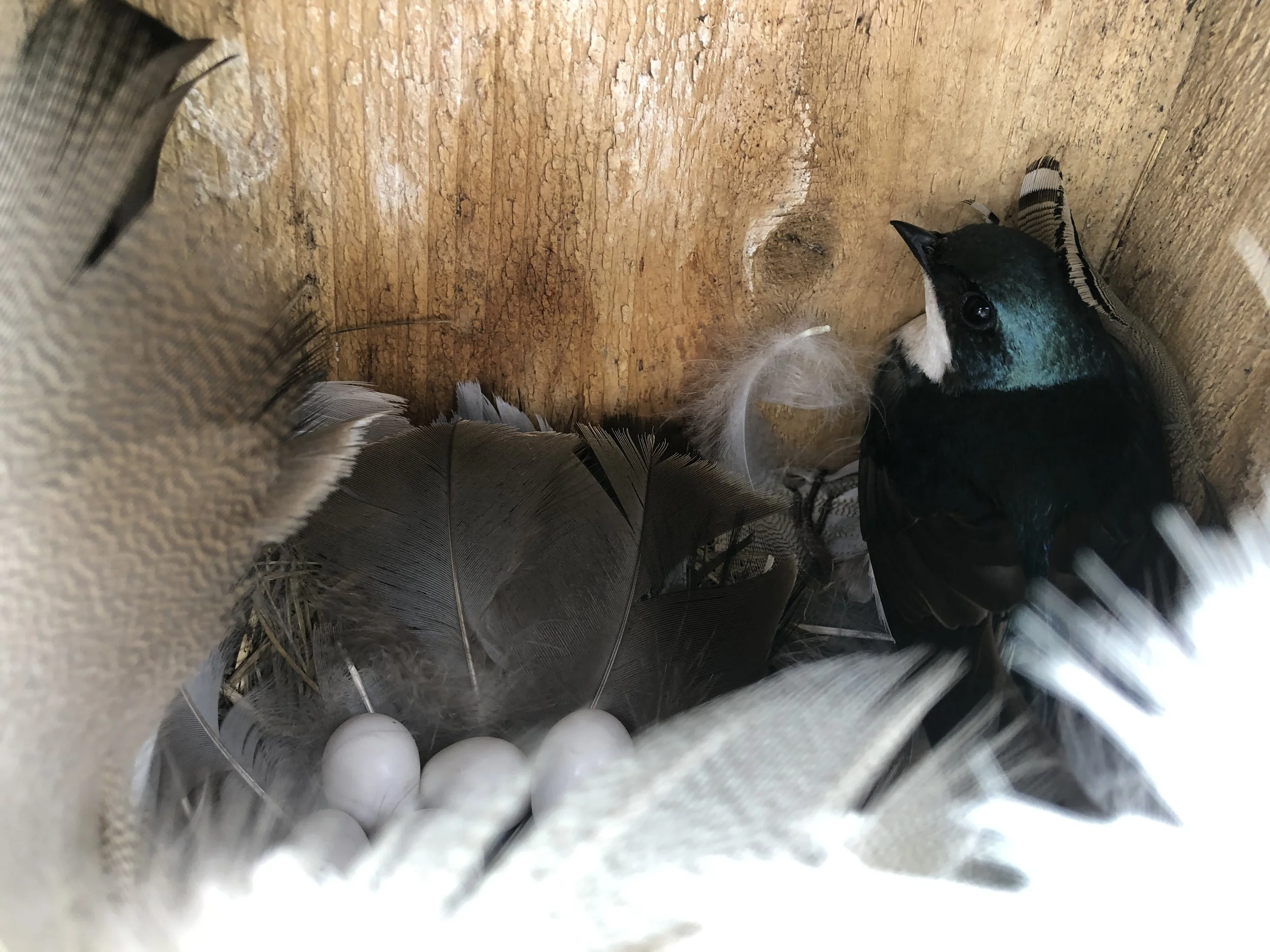 The bluebird box nesting sites are checked every 3-4 days during breeding season, which runs from mid-May to mid-July. The nest boxes are generally checked by either our team or trained volunteers, and all participants follow the NestWatch Code of Conduct. During these checks, monitors are primarily looking to identify what species is occupying the box, and track the success of the clutch of the eggs.